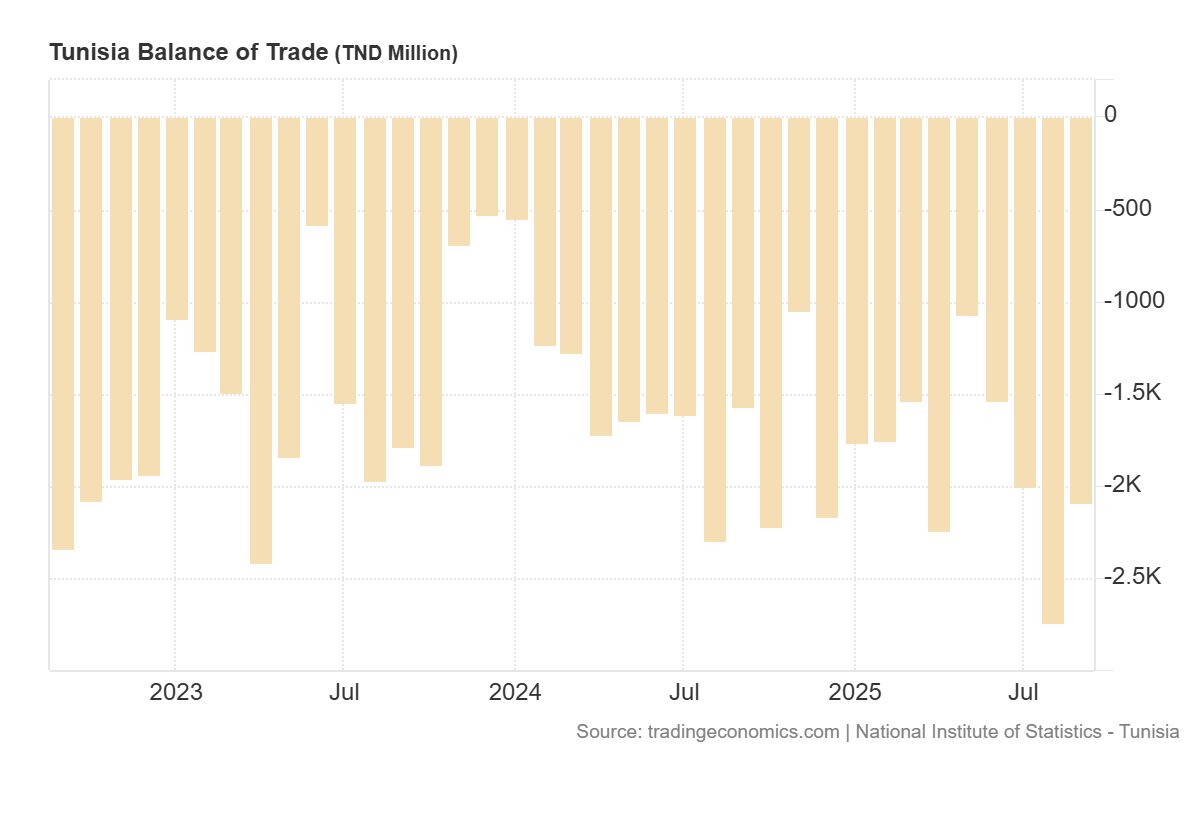 ويحذر بن بوهالي من العجز المزمن في الميزان التجاري التونسي، والذي تفاقم بفعل العجز في ميزان الطاقة المستمر منذ سنوات. ويشير إلى أن الصادرات التونسية شهدت ركودًا بنمو سلبي في الربع الثاني من العام الجاري، مما زاد الضغط على الحساب الجاري والدينار على حد سواء.