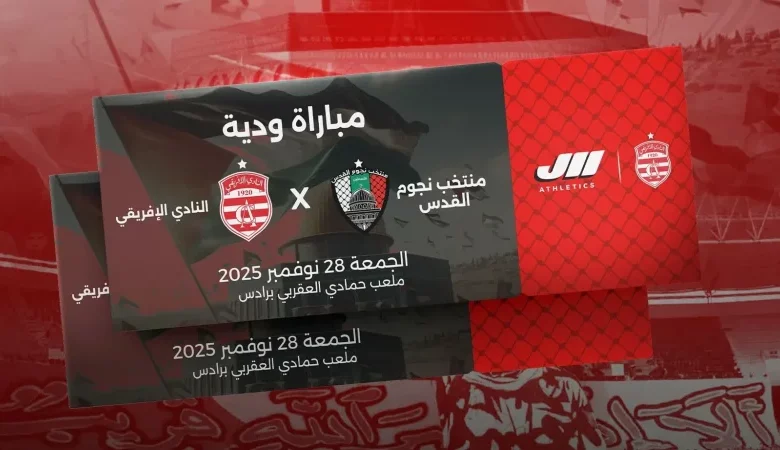أعلنت لجنة التنظيم بالنادي الإفريقي عن بدء بيع تذاكر المباراة الدولية الودية التي ستجمع الفريق بمنتخب نجوم القدس الفلسطيني، يوم الجمعة 28 نوفمبر 2025 بملعب حمادي العقربي برادس، ابتداءً من الساعة الرابعة مساءً (16:00).
