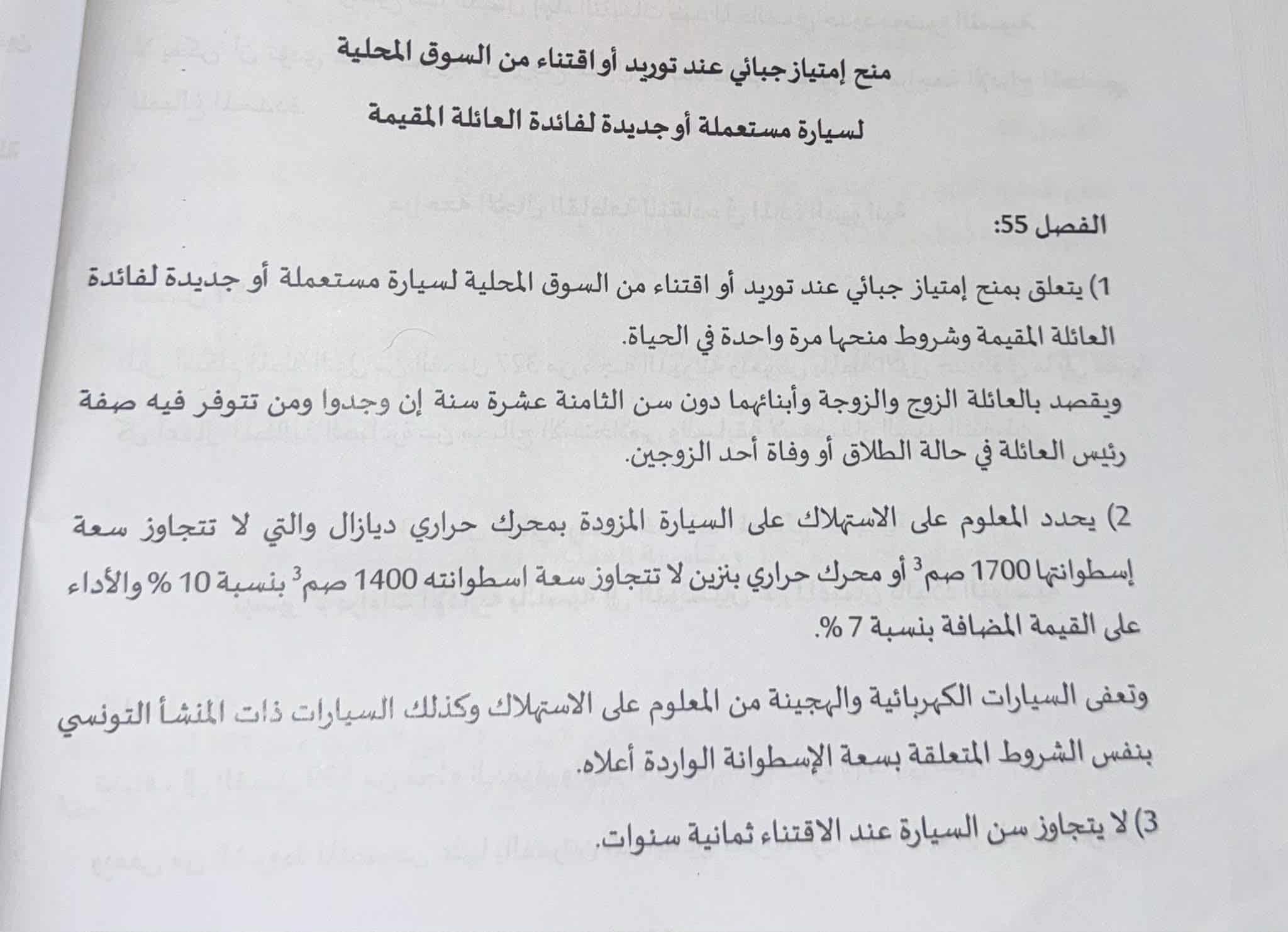 صادق مجلس نواب الشعب، ضمن مناقشة فصول مشروع قانون المالية، على الفصل 55 المتعلّق بتمكين كلّ عائلة من توريد سيارة واحدة بشروط محدّدة، وذلك بعد سحب المقترحين السابقين لفائدة الصيغة التوافقية التي حازت 131 صوتًا.