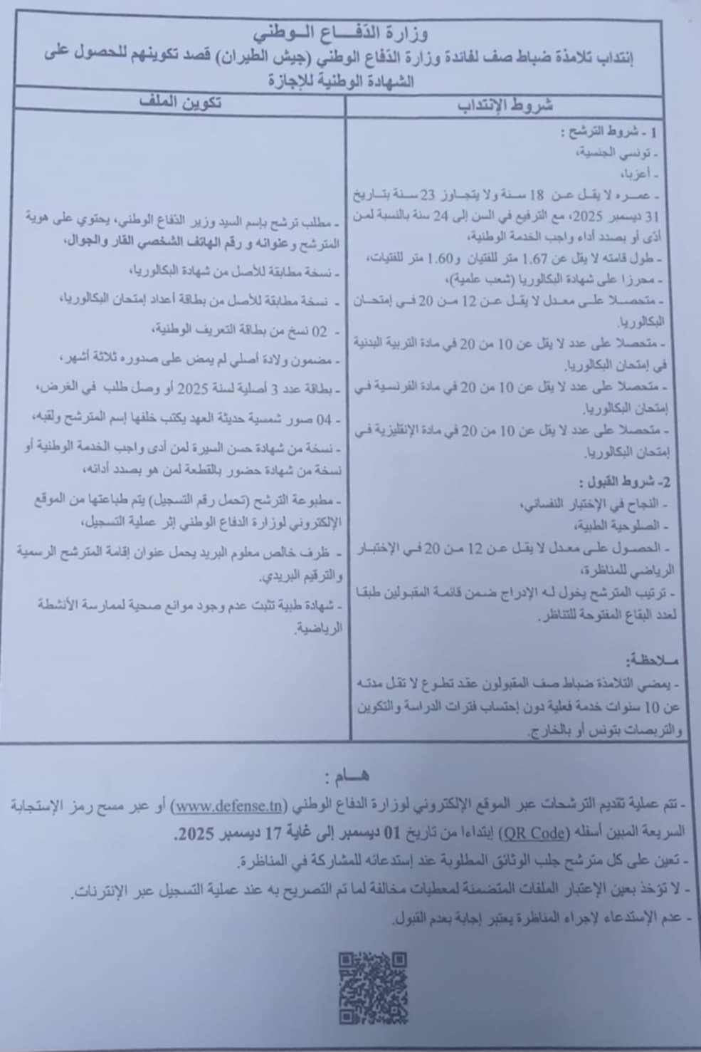أعلنت وزارة الدفاع الوطني عن فتح باب التسجيل بداية من اليوم الاثنين 1 ديسمبر 2025 للتقديم في مناظرة انتداب تلامذة ضباط صف لفائدة جيش الطيران، وذلك قصد تكوينهم للحصول على الشهادة الوطنية للإجازة.
