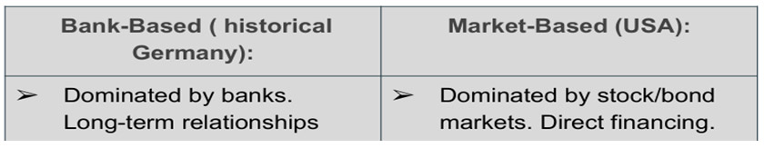 يجدر التنبيه إلى أن النظم المالية تختلف من بلد إلى آخر، فبعضها يعتمد أساسًا على البنوك، في حين يرتكز بعضها الآخر على أسواق رأس المال.