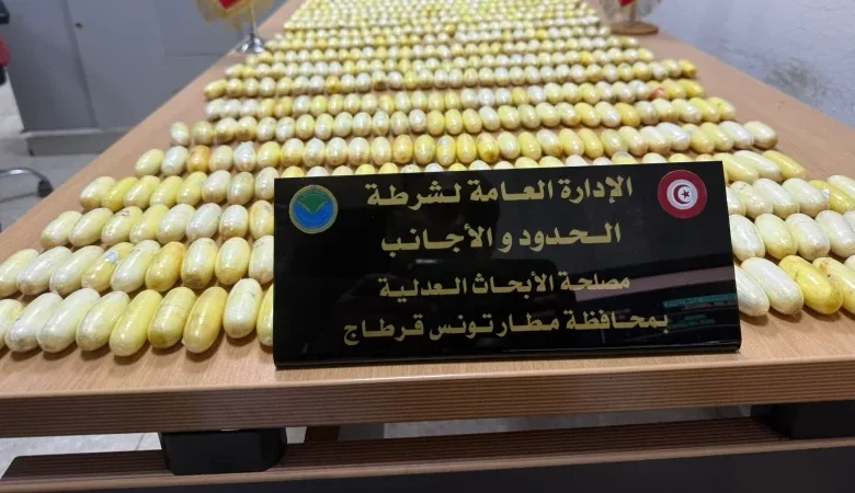 تمكنت مصالح محافظة شرطة الحدود بمطار تونس قرطاج مؤخراً من إحباط محاولة تهريب كمية كبيرة من المخدرات تقدر بـ 627 كبسولة وزنها أكثر من 9 كلغ من الكوكايين الخام، والإطاحة بعناصر شبكة أجنبية تضم مواطنين أفارقة من دول إفريقيا جنوب الصحراء، تنشط في تهريب المخدرات إلى تونس عبر النقاط الحدودية.